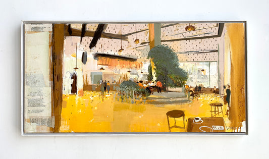 Acrylic on canvas offers the desired freedom to explore these senes. Bits of novel text makes its way into some pieces as overheard conversation. A range of restrained to illustrative painting styles are used to convey the nature of the moment, each one savory and temporary.