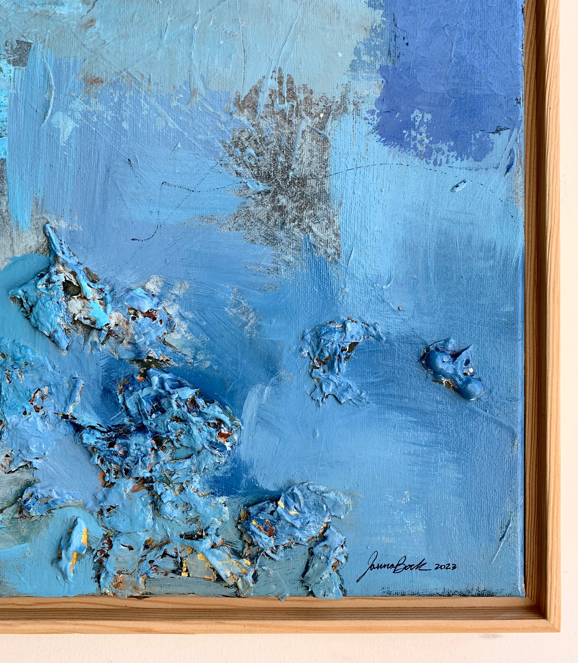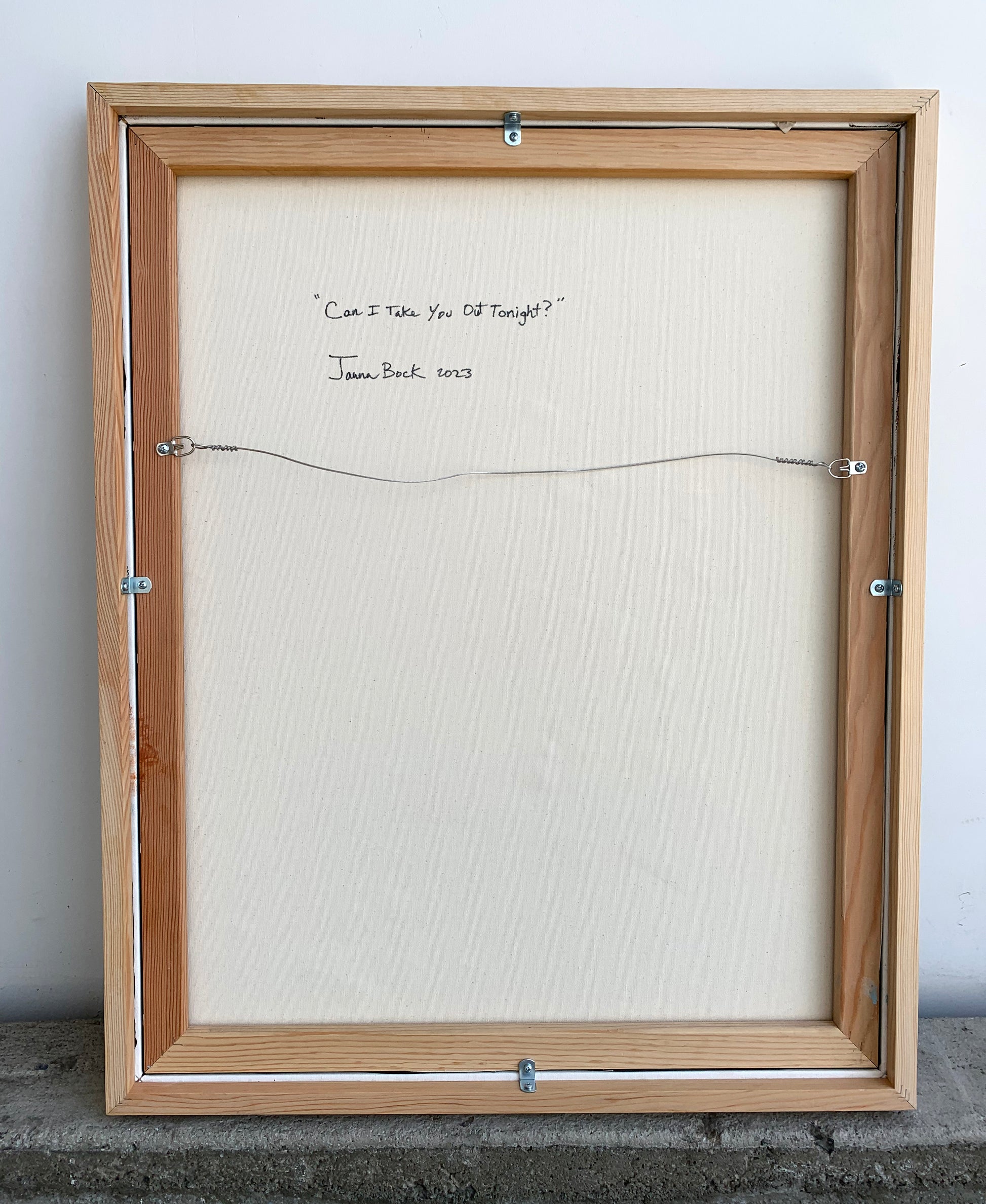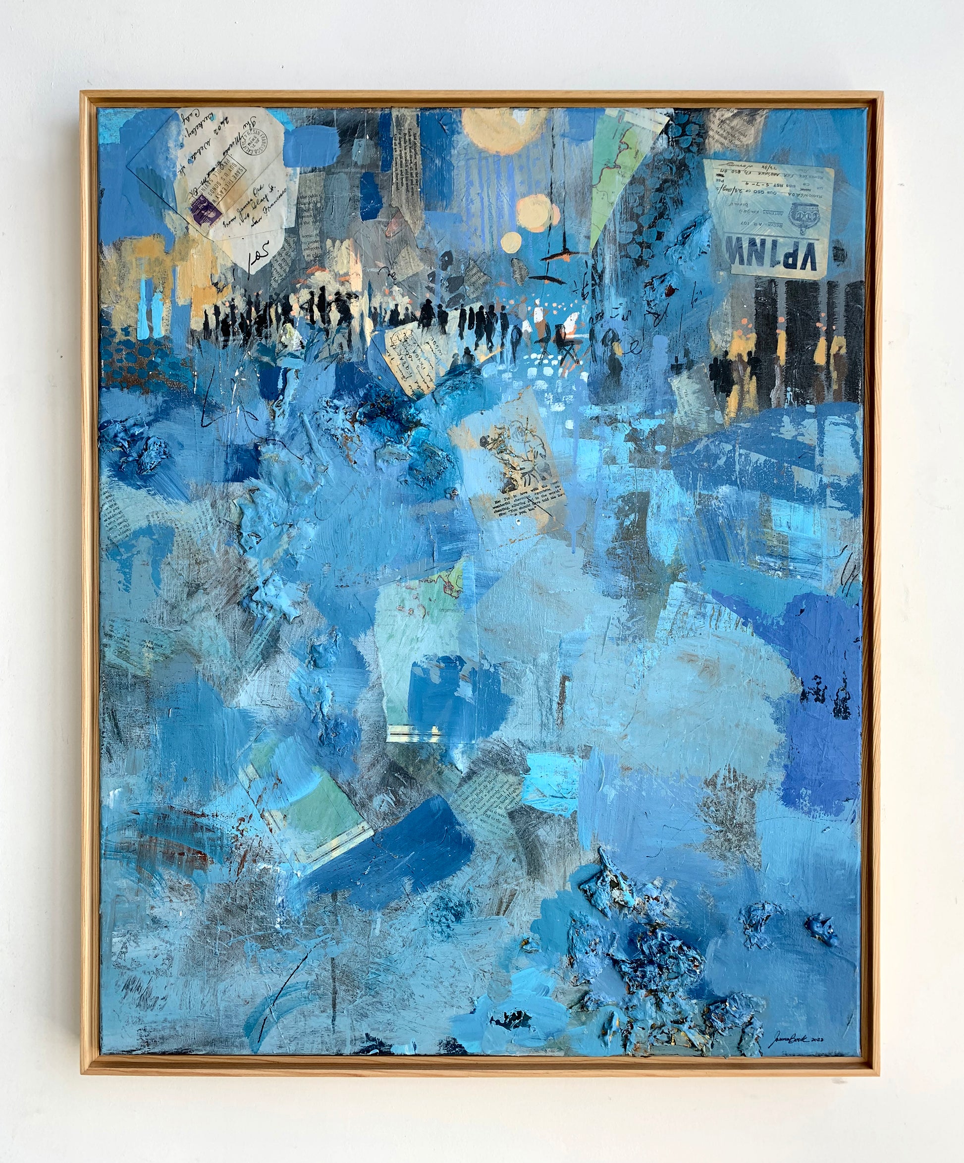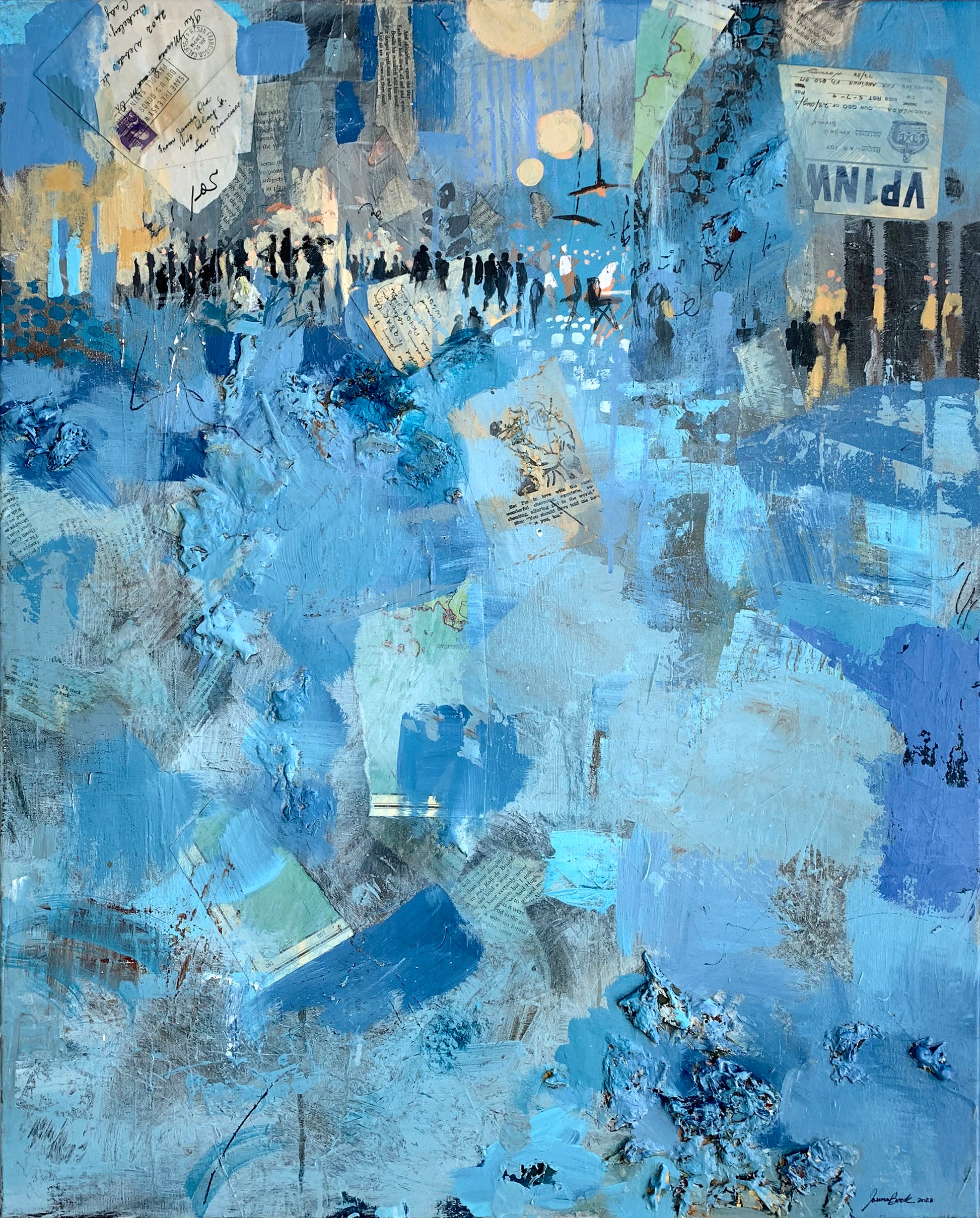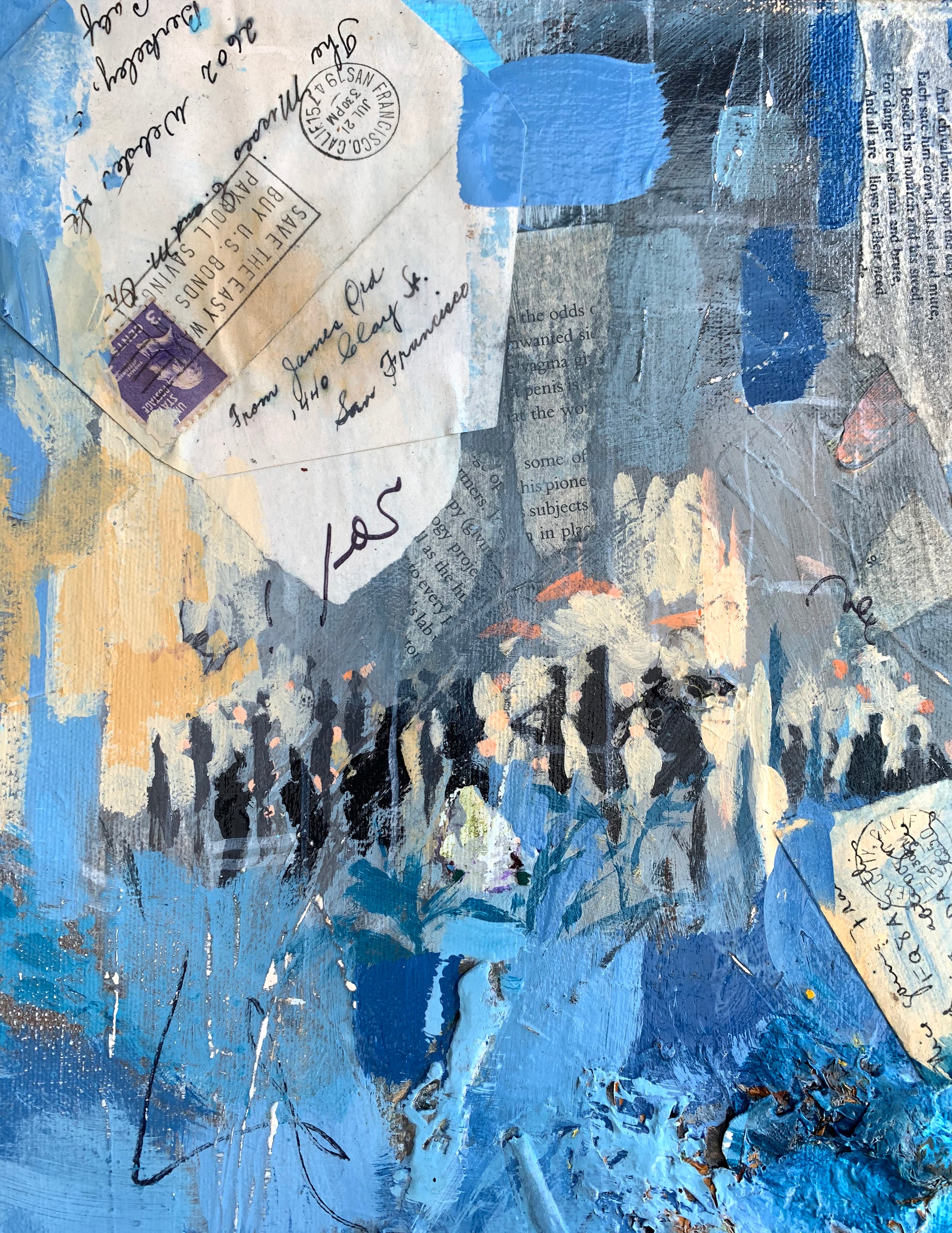 This painting is the result of a lot of experimentation. The raised, textured areas are saved dry paint scrapings from my palette. The papers were found at a vintage shop in east L.A. Some are personal letters, a map, and one is from a 1950s humorous pamphlet. The people are from memories of restaurants and bars I've been to in downtown L.A. I was thinking of the feeling of being among that moving crowd, but still far enough away that I could observe from a peaceful distance. The bottom section is intentionally left abstract and open, creating that implied distance and room to breath.