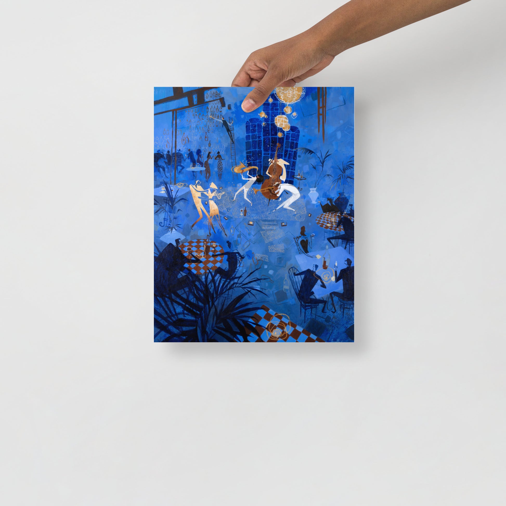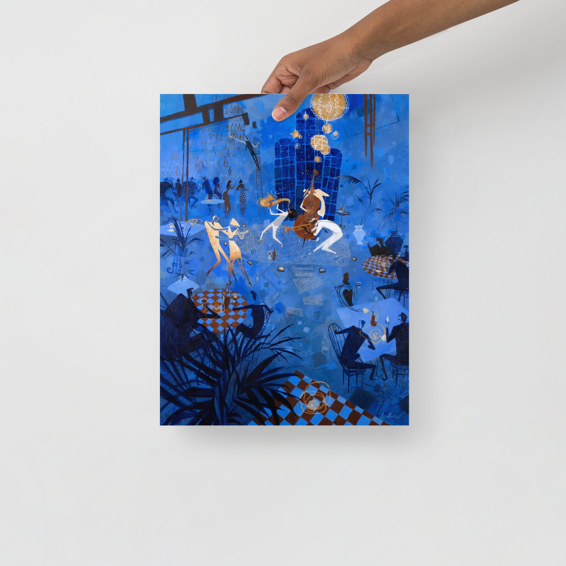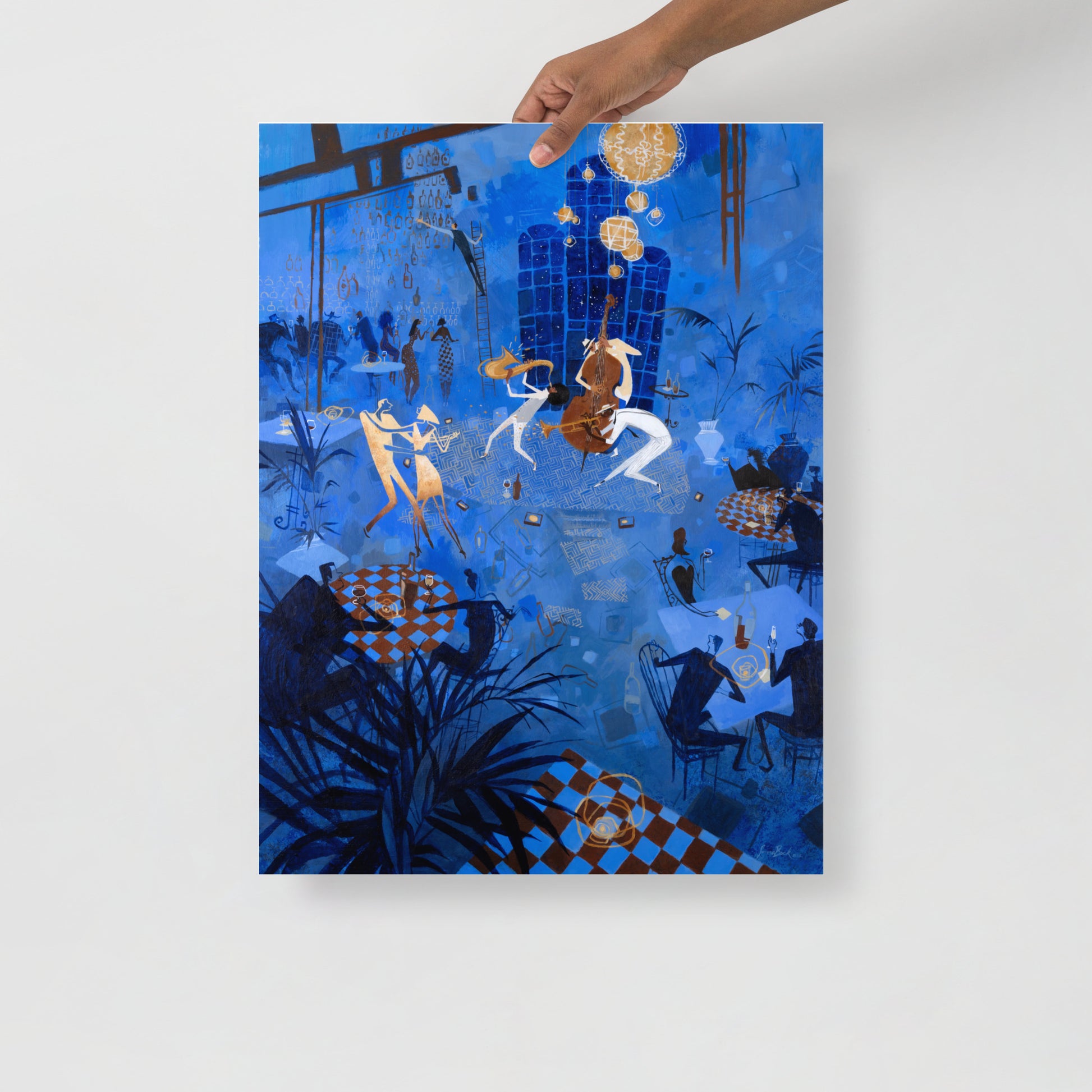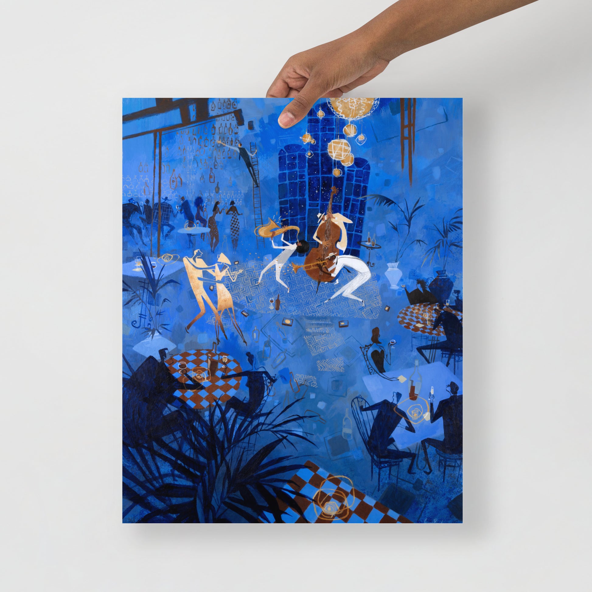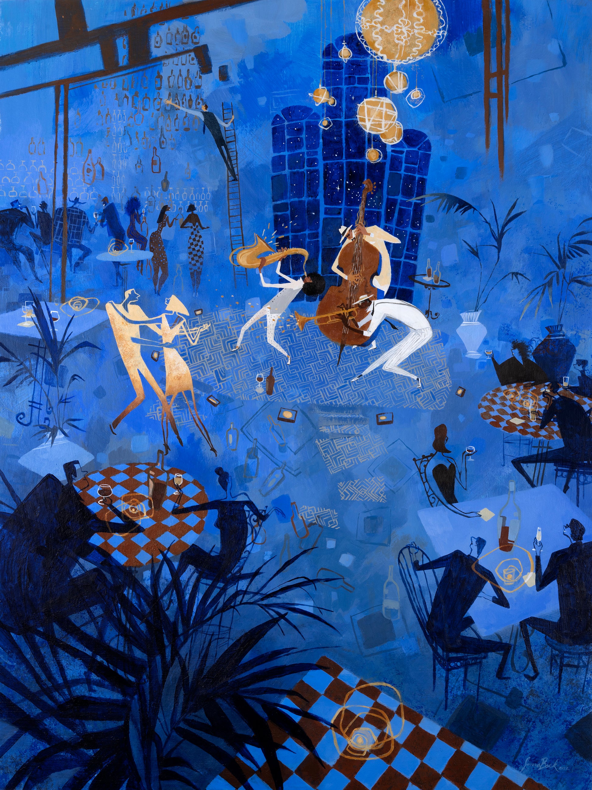 Enjoy this scene full of festive movement and detail of a live jazz band playing at the bar tonight! Original painting is acrylic on illustration board 30"x40".