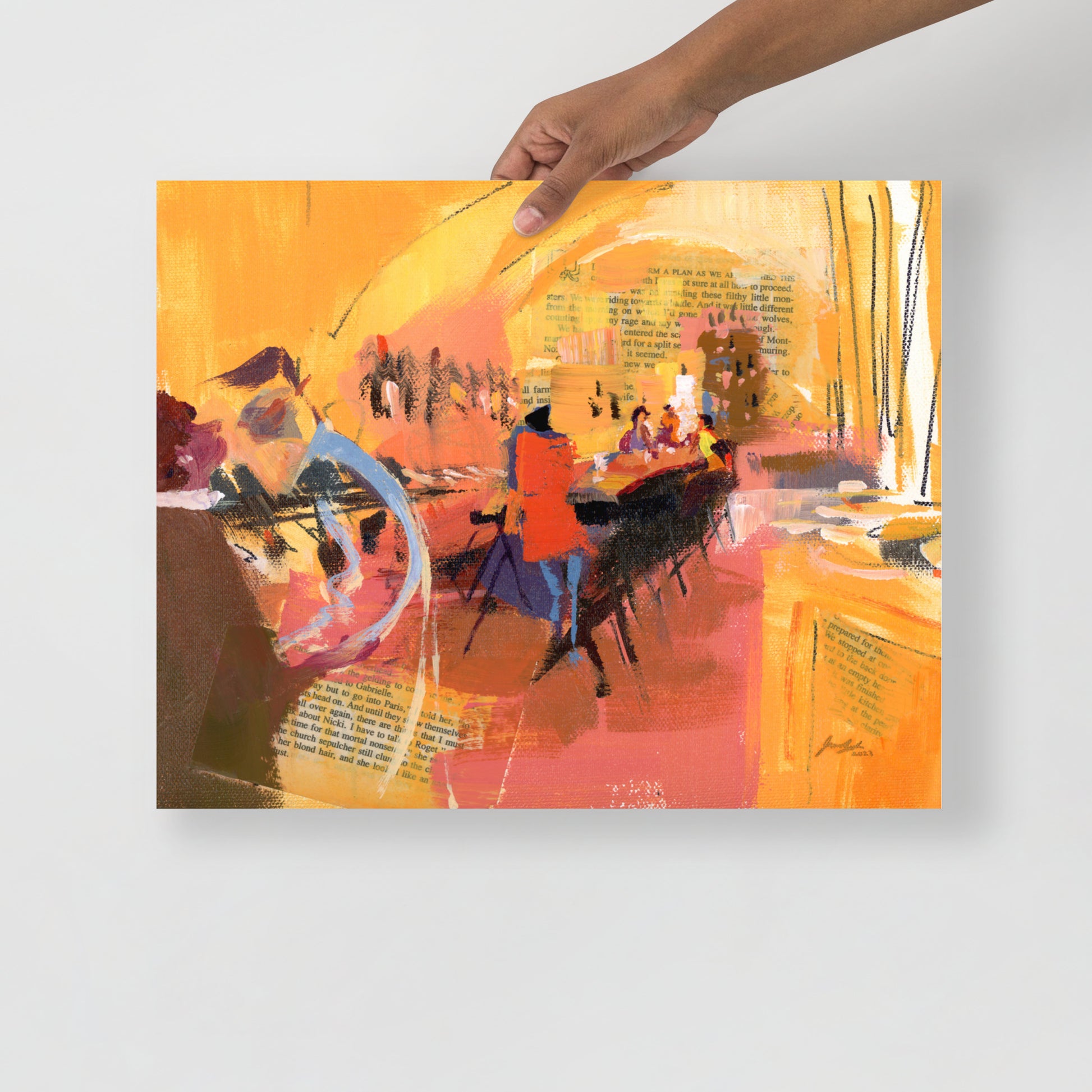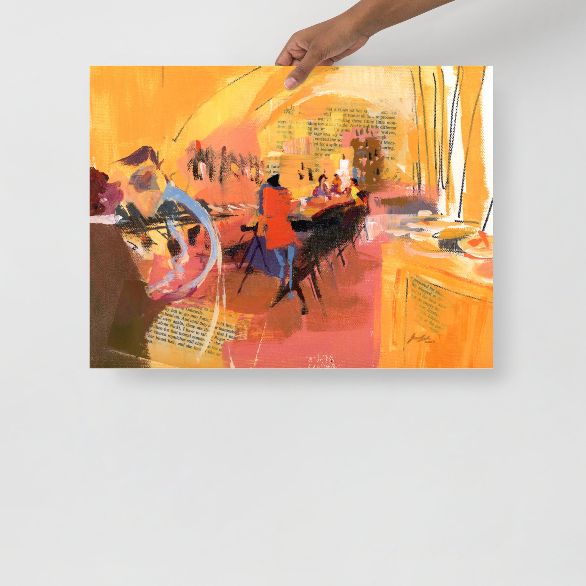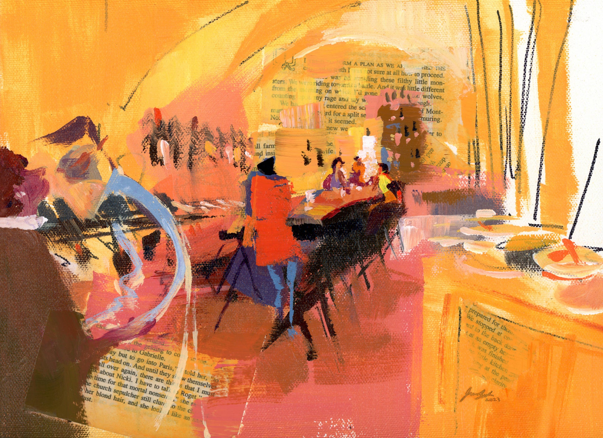The wine, the atmosphere, the connections. These are wonderful moments. The vibrant color and abstracted scene conveys a festive atmosphere that could be from a memory or a dream of a treasured place and time.