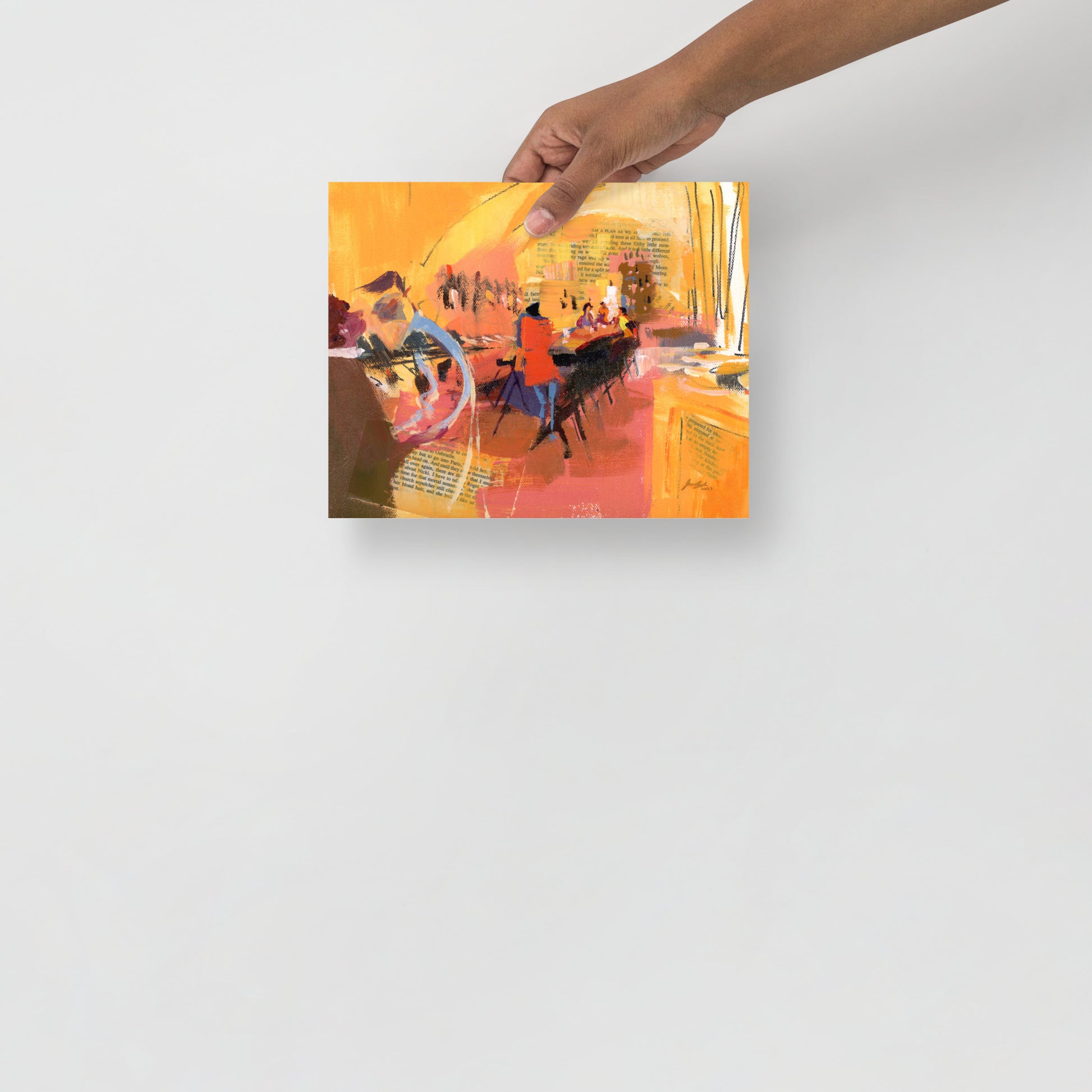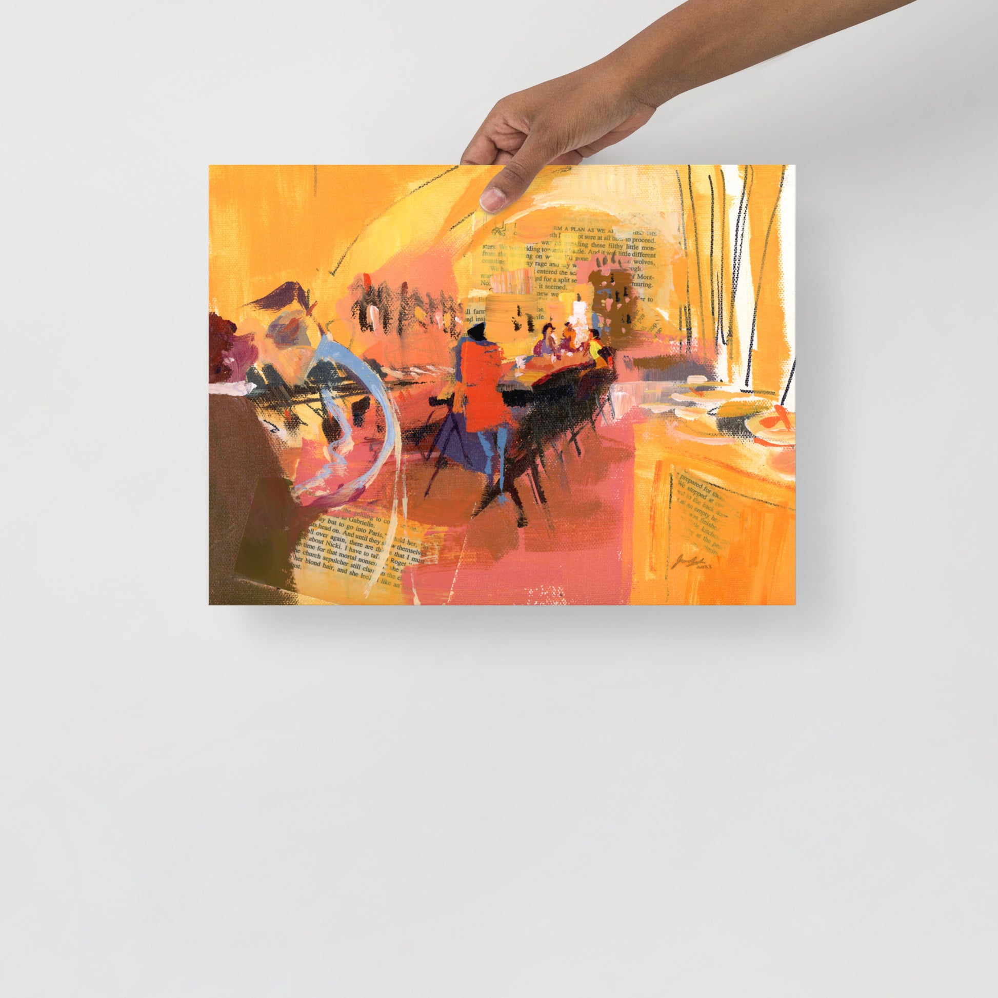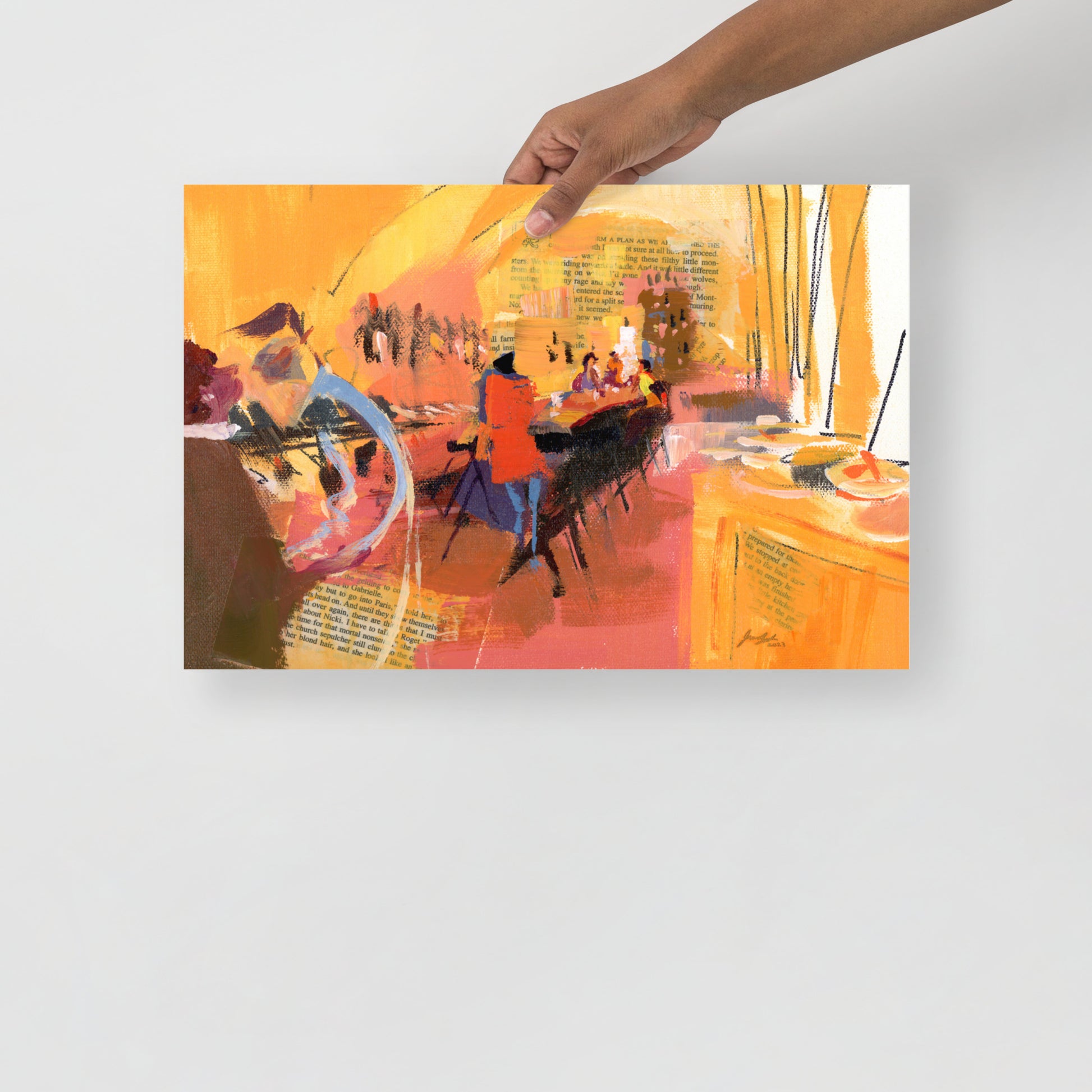 The wine, the atmosphere, the connections. These are wonderful moments. The vibrant color and abstracted scene conveys a festive atmosphere that could be from a memory or a dream of a treasured place and time.
