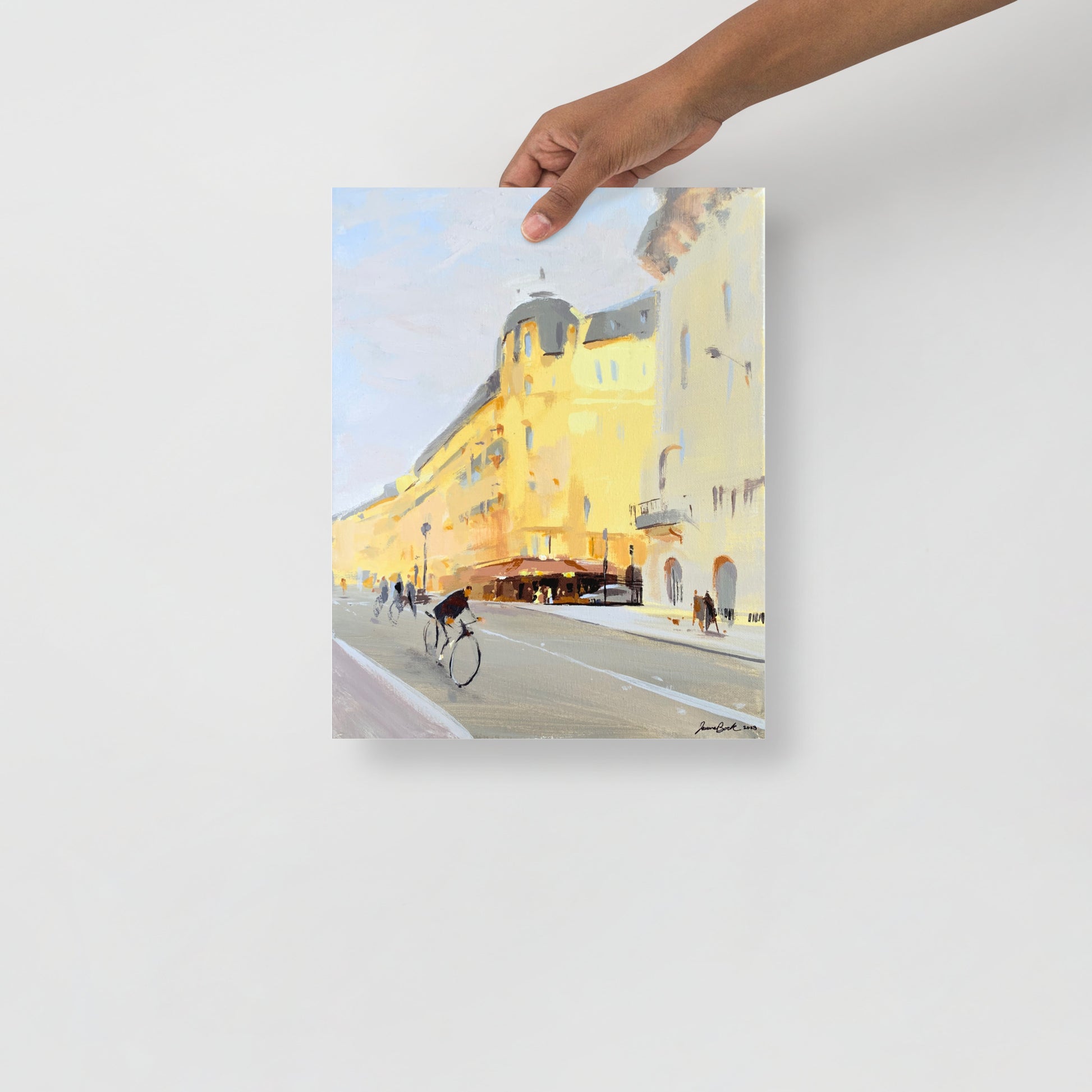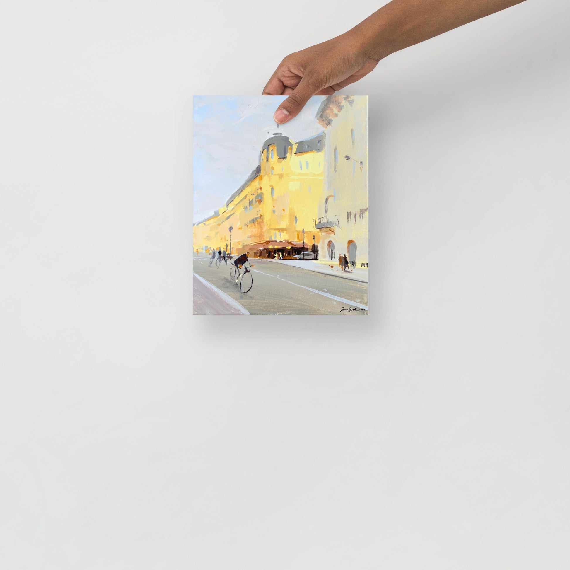 Walking along the Seine on an overcast Sunday morning in March. People walk their dogs, share a light breakfast, going everywhere on their bicycle. Based on a moment in Paris, France.