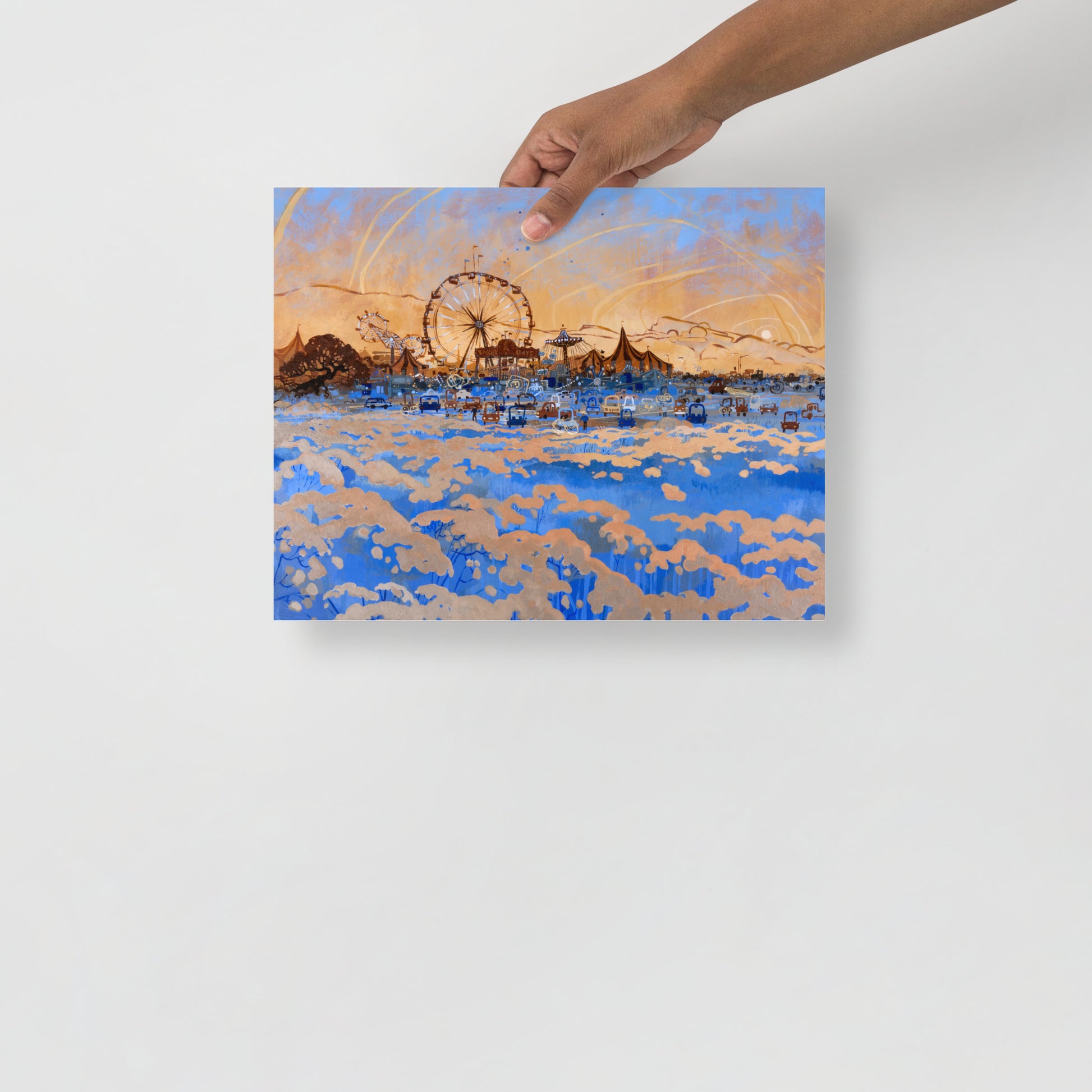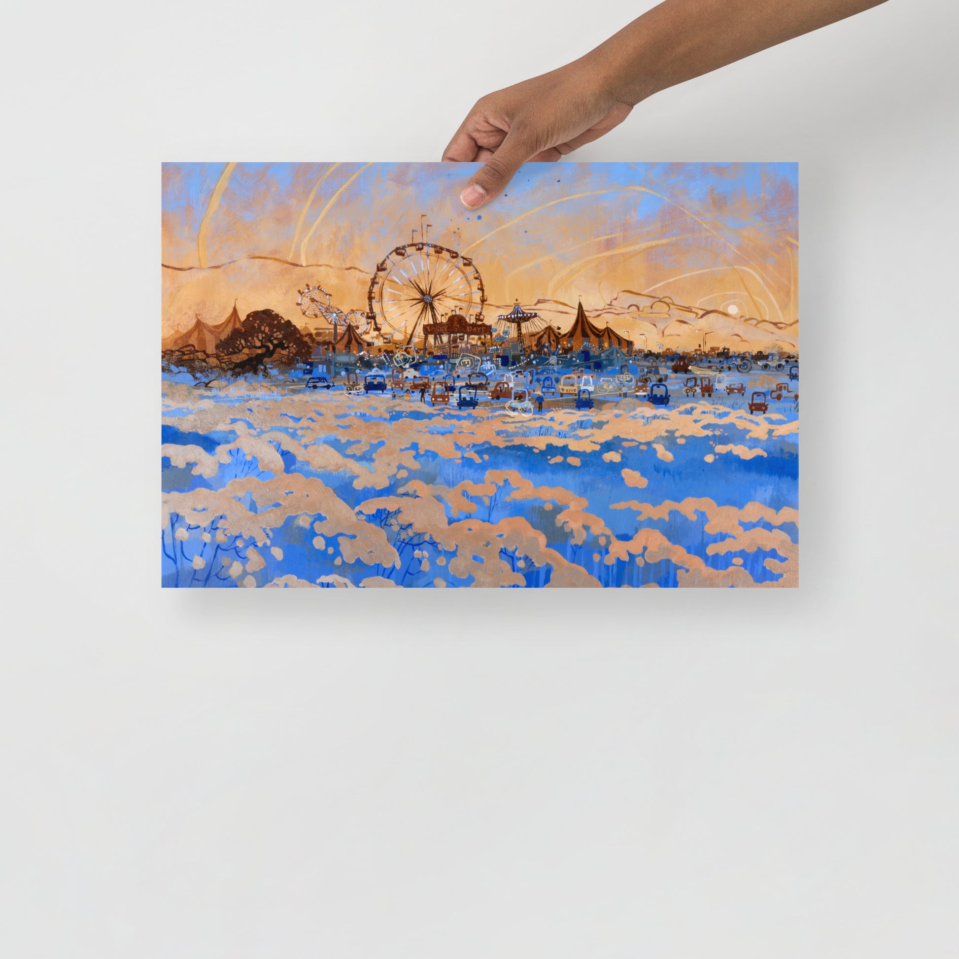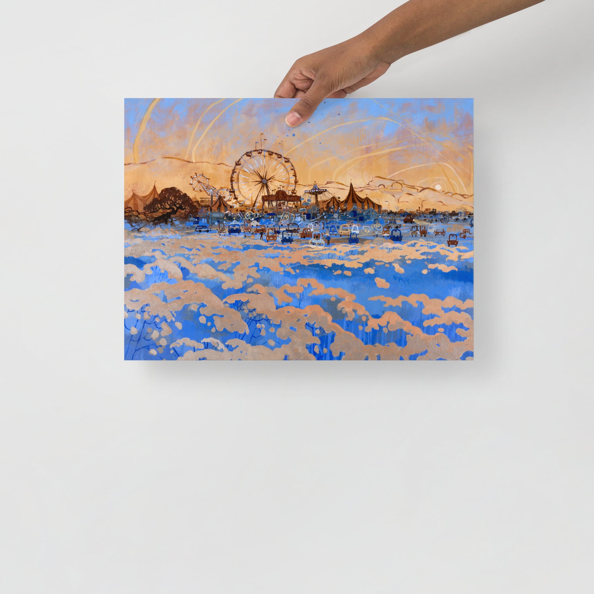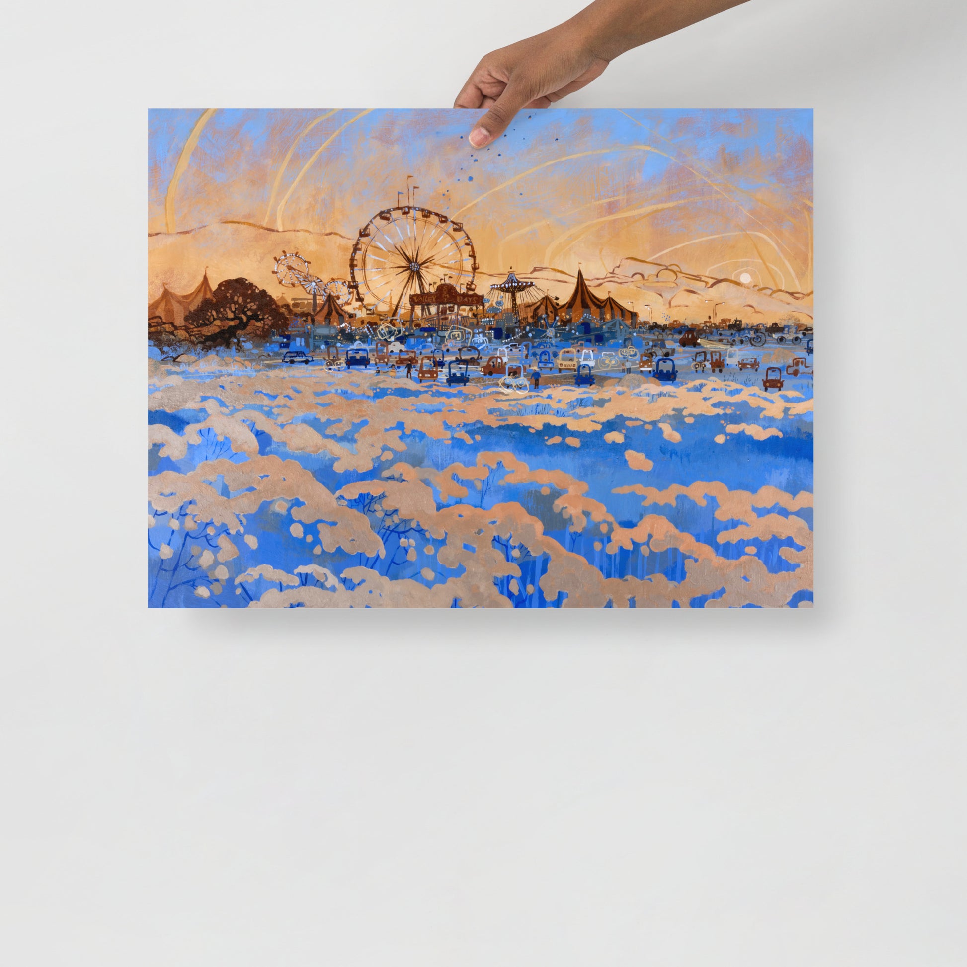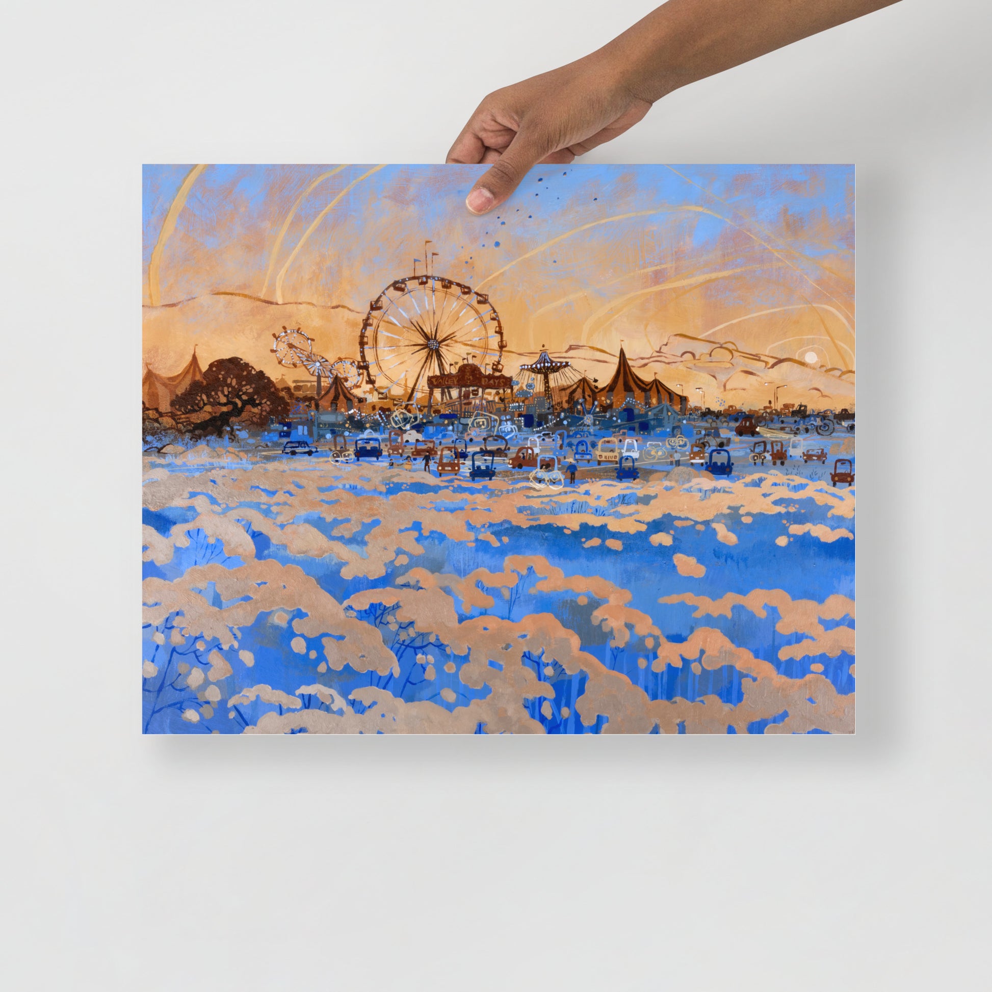 The sun sets on another summer day at the local carnival, enjoyed by children and adults alike. Original painting is acrylic paint on 30"x40" illustration board.