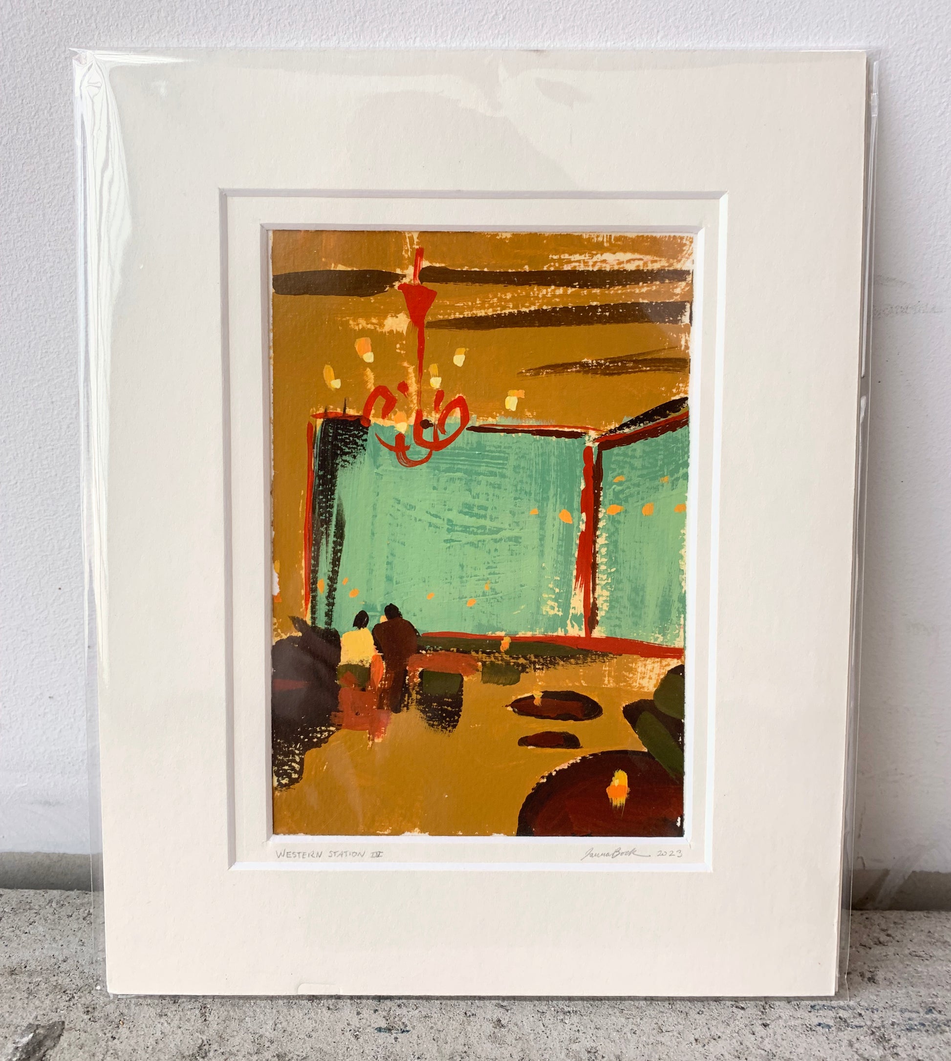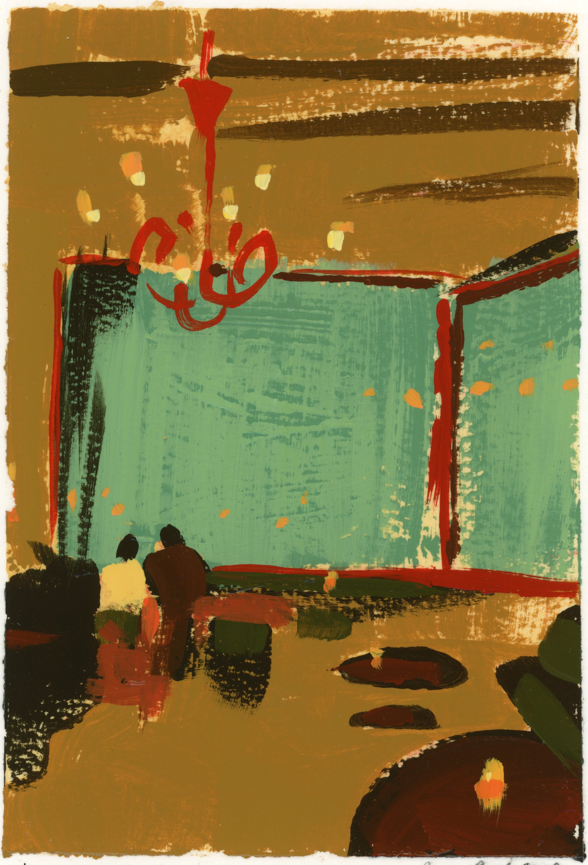 Original work. Each piece is a little different, exploring the possible small differences of this image and their effect. An abstracted couple share a corner over a drink in a cozy place.