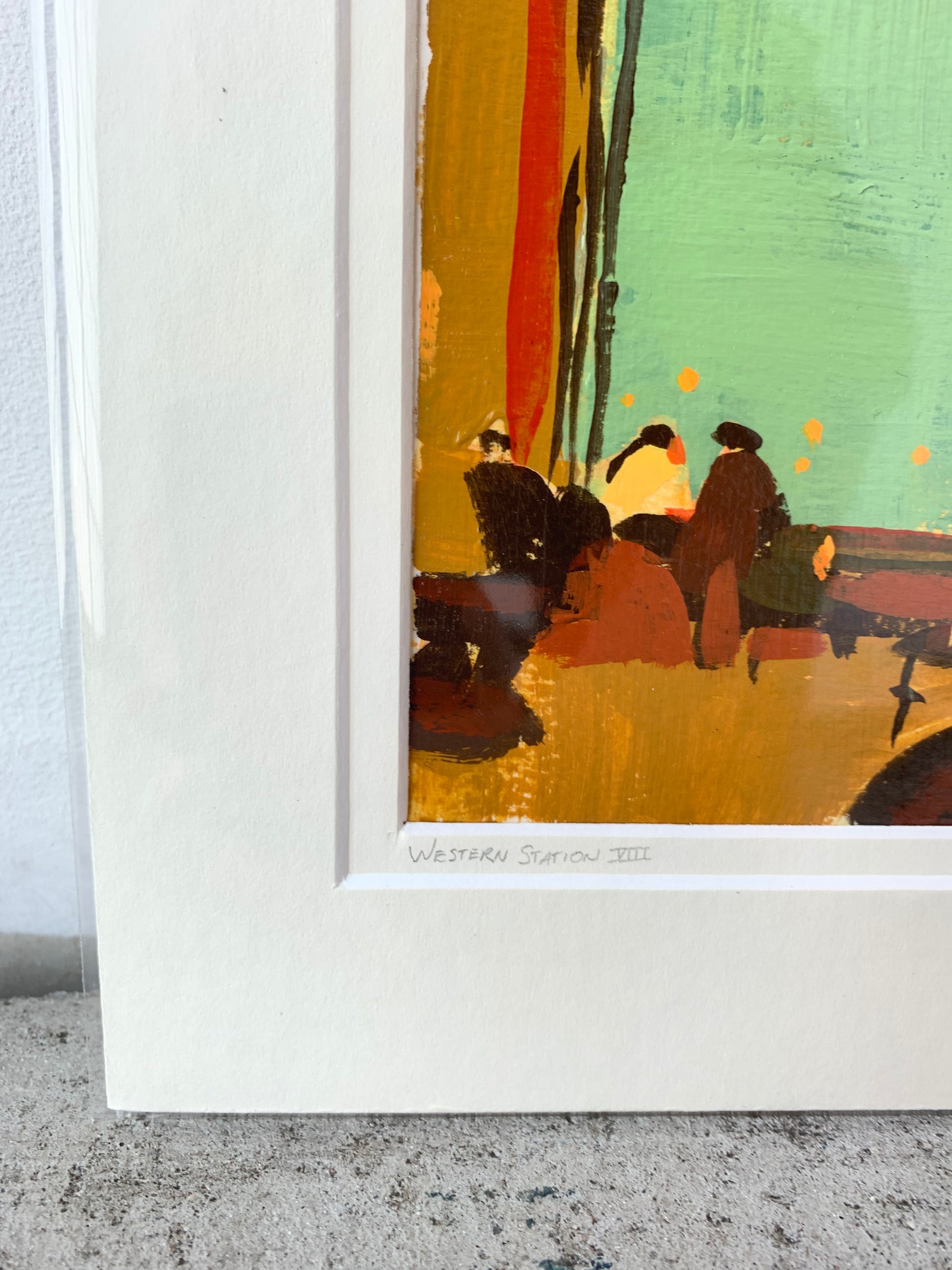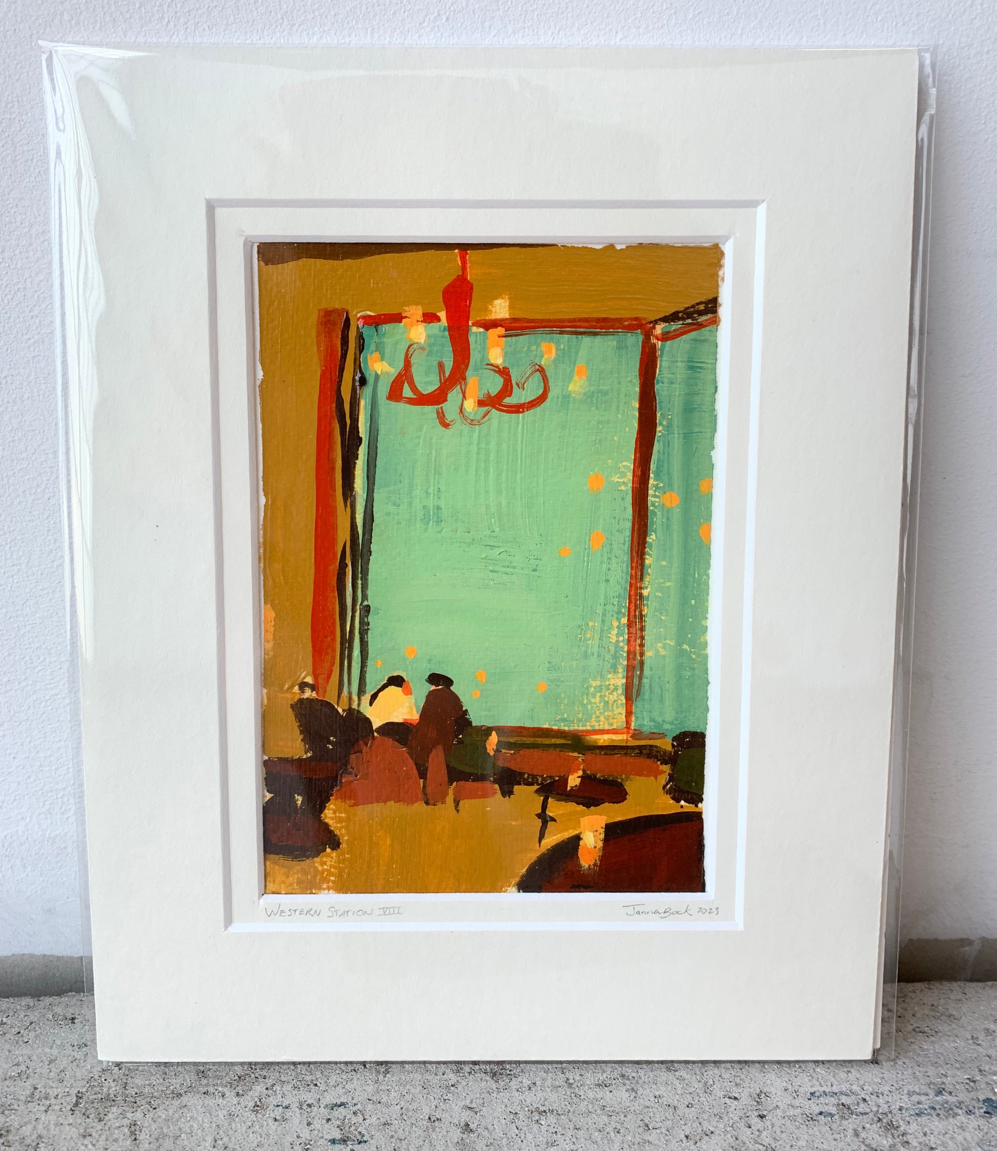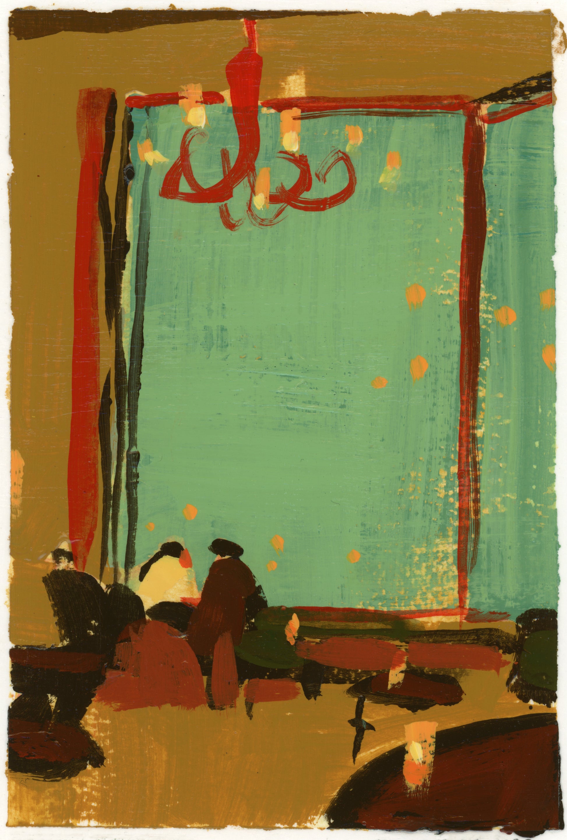Original work. Each piece is a little different, exploring the possible small differences of this image and their effect. An abstracted couple share a corner over a drink in a cozy place.