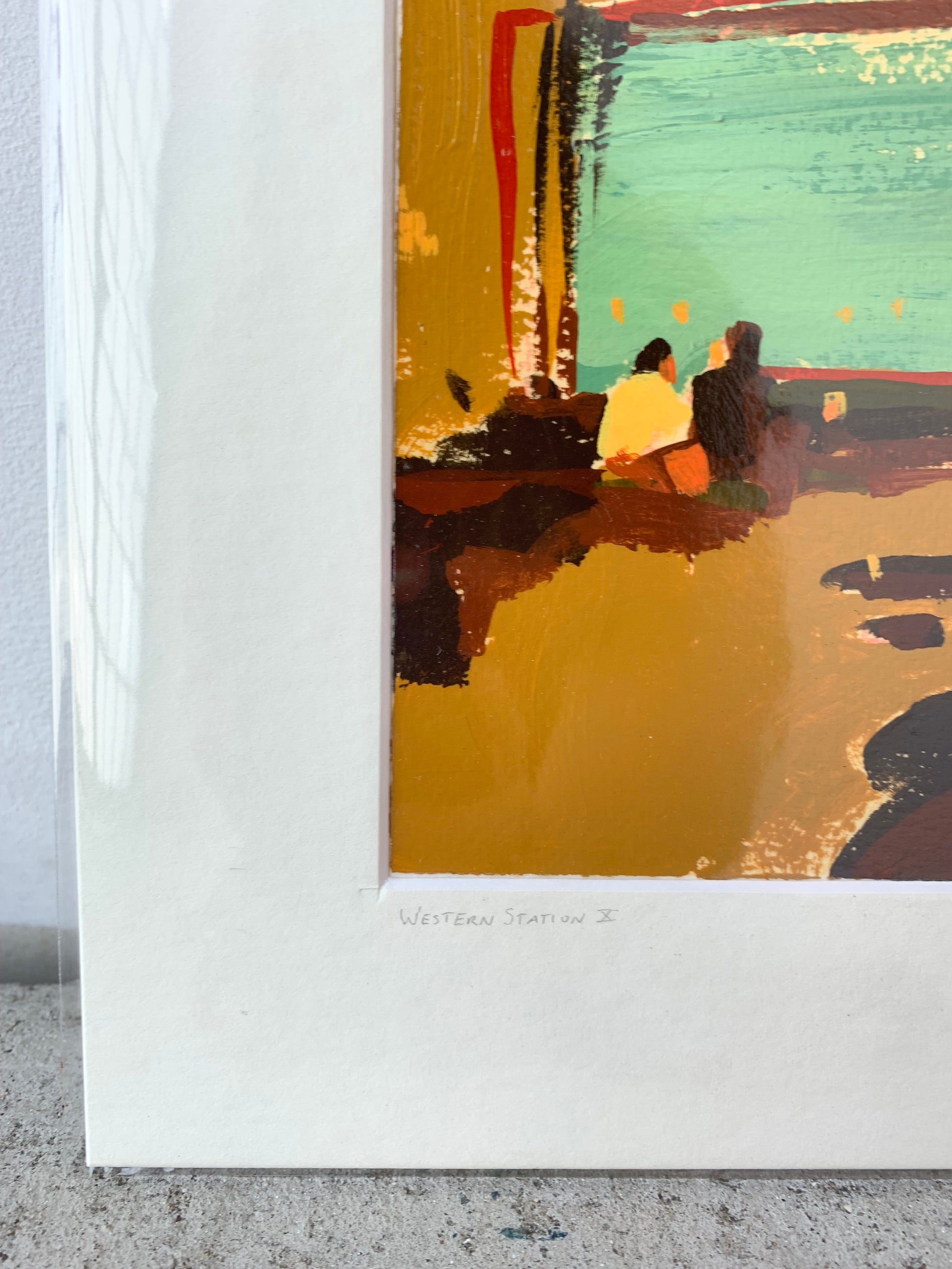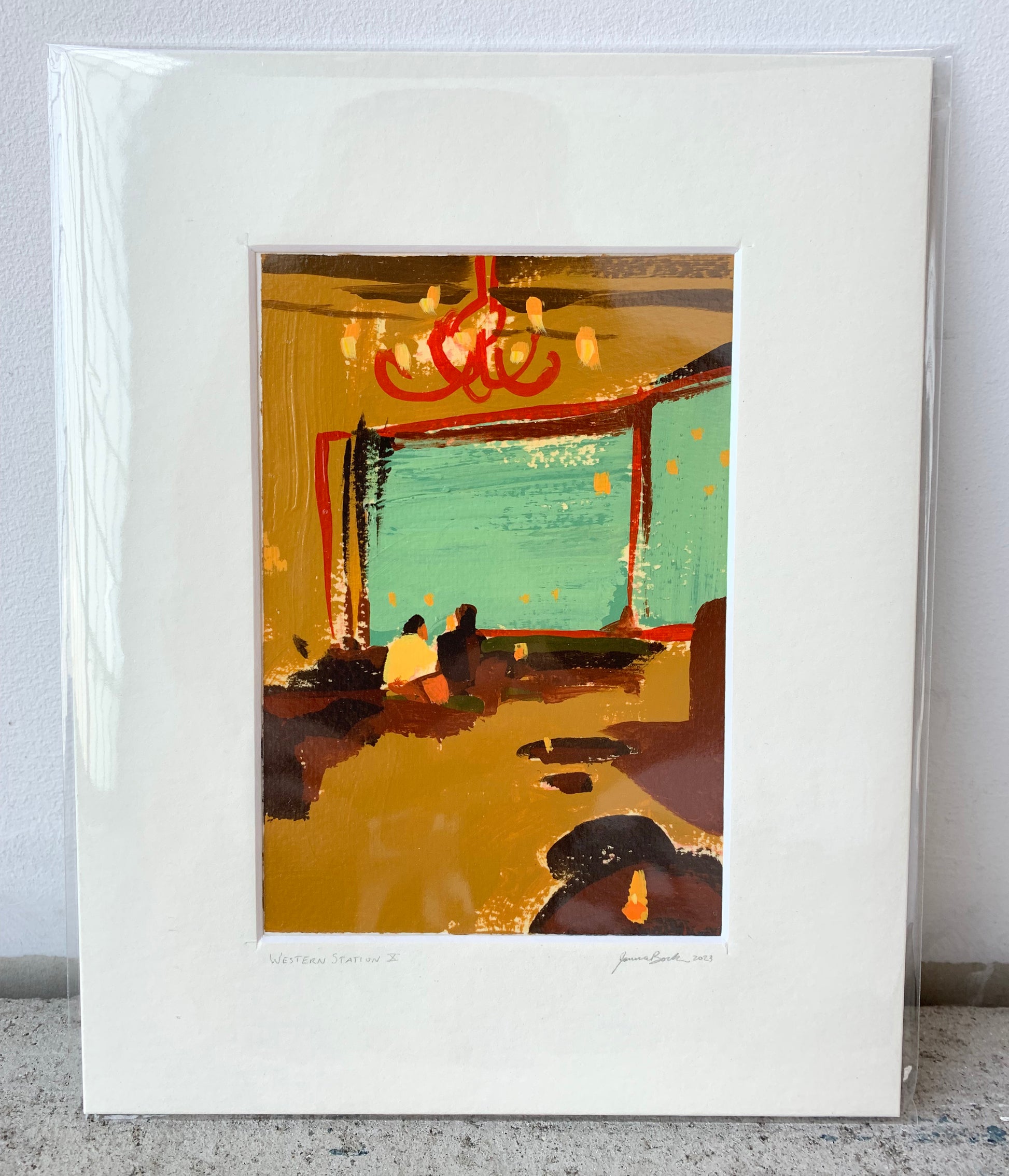 Original work. Each piece is a little different, exploring the possible small differences of this image and their effect. An abstracted couple share a corner over a drink in a cozy place.